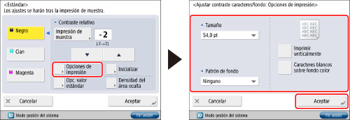 Si aumenta el valor de [Opc. valor estándar], el fondo se vuelve más denso, mientras que si reduce el valor, el fondo se hace más claro. Cuando se selecciona [Caracteres blancos sobre fondo color], si aumenta el valor estándar, el fondo se vuelve más denso, mientras que si reduce el valor, el fondo se hace más claro.