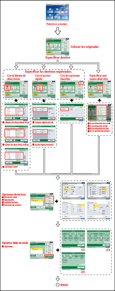 Se pulsa para seleccionar y utilizar otros modos disponibles para leer y enviar. Configure funciones de envío útiles, como enviar juntos originales de distinto tamaño o enviar originales de doble cara.