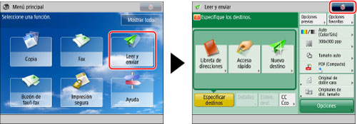 En la pantalla Leer y enviar aparecen dos accesos directos a las opciones. Estos accesos directos pueden cambiarse por las funciones que utiliza con frecuencia.