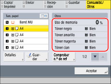 Puede comprobar el estado de los consumibles, como la información detallada del papel, la cantidad restante de tóner y grapas, y el estado de copia de seguridad de los datos almacenados. También puede guardar/establecer el tipo de papel que debe cargarse en un origen de papel.