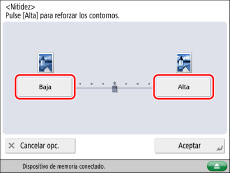 Si utiliza el espacio avanzado de otro equipo de la red o un dispositivo de memoria, la opción para [Nitidez] no es válida si se cumplen todas estas condiciones. La opción se refleja en la imagen mostrada para [Mostrar imagen], pero no para la imagen leída real.