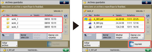 Seleccione la ubicación en la que está guardada el archivo que desee imprimir → seleccione el archivo deseado → pulse [Imprimir].