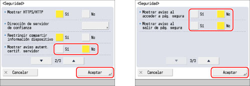 Pulse [Seguridad] → seleccione [Sí] o [No] para el mensaje de advertencia cuya opción desee cambiar → pulse [Aceptar].