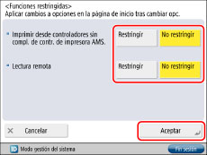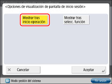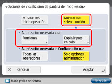 Las opciones especificadas desde el panel de control surten efecto tras haber reiniciado el equipo, después del procedimiento. Si <Aplicar los cambios a las opciones desde Configuración> se muestra en la parte de abajo de la pantalla táctil, puede pulsar [Aplicar camb. opc.] en