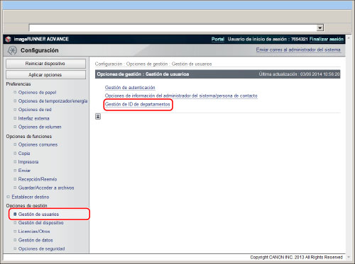 Seleccione esta casilla de verificación para establecer la Gestión de ID de departamento para las funciones [Escáner] y [Acceso a Internet].