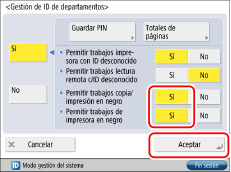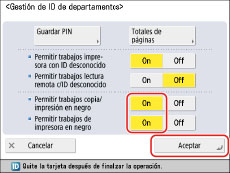 Desactive <Permitir trabajos copia/impresión en B/N> si no desea mostrar [Copia/Impres. en negro] en pantalla para introducir el ID de departamento y el PIN o la pantalla para introducir una tarjeta de control.