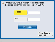 Si utiliza funciones como Copiar/Imprimir, Leer y guardar, y Leer y enviar en el modo Auto (Color/Negro) o el modo Auto (Color/Gris), debe introducir el ID de departamento y el PIN. Si utiliza las funciones Copiar o Imprimir en el modo Negro, no es necesario que introduzca un ID de departamento y un PIN.