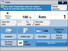Si se pulsa [Copia/Impres. en negro] para iniciar sesión mientras está activada la opción [Permitir trabajos copia/impresión en B/N], en la pantalla de funciones básicas de copia aparece un mensaje similar al siguiente indicando que sólo se puede copiar en blanco y negro.