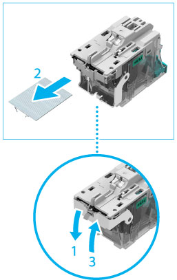 3. Ponga de nuevo la pestaña de la caja de grapas en su posición original. |