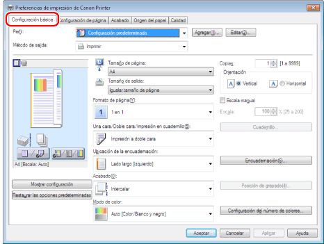 Para conocer las instrucciones acerca de cómo mostrar la pantalla del controlador de impresora, consulte "Impresión" o "Configurar las opciones de impresión prefijadas".