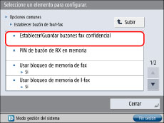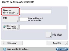 (Configuración) → [Opciones de funciones] → [Recepción/Reenvío] → [Opciones comunes] → [Establecer buzón de fax/I-fax] → [Establecer/Guardar buzones fax confidencial].