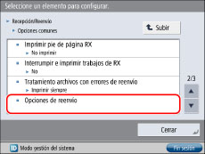 (Configuración) → [Opciones de funciones] → [Recepción/Reenvío] → [Opciones comunes] → [Opciones de reenvío].