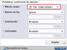 Pulse [Condiciones] → seleccione [Fax: Línea 1] para el método de recepción.