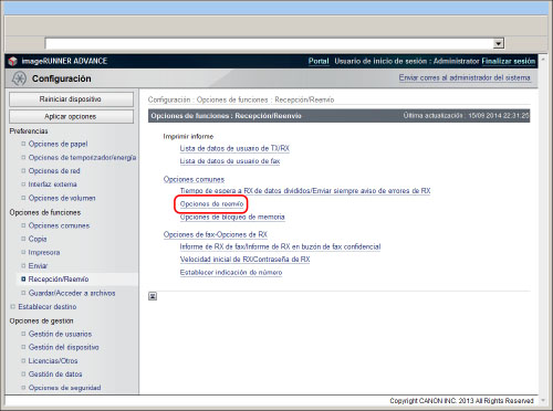 Acceda a la IU remota → haga clic en [Configuración] → [Recepción/Reenvío] → [Opciones de reenvío].
