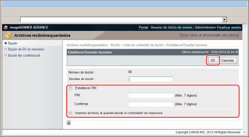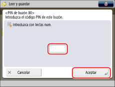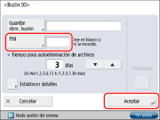 Pulse [PIN] →introduzca un PIN de siete dígitos para el buzón → pulse [Aceptar] → [Cerrar].