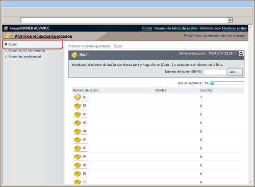 Acceda a la IU remota → haga clic en [Archivos recibidos/guardados] → [Buzón].