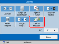 Este modo permitirá que se le notifique en su escritorio que el trabajo se ha completado. Para poder utilizar el modo Aviso fin de trabajo, tiene que guardar de antemano las direcciones de e-mail en la libreta de direcciones.