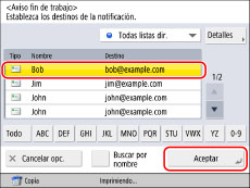 Seleccione el destino al que se debe enviar el aviso de fin de trabajo → pulse [Aceptar].