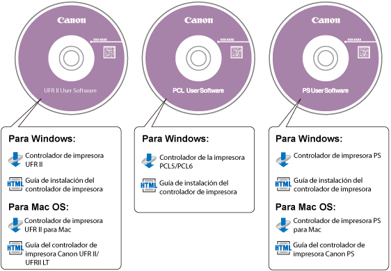 El controlador de impresora se instala desde el User Software CD-ROM. Si hay más de un CD-ROM, utilice la siguiente información como referencia y seleccione el CD-ROM y el controlador de impresora adecuados.