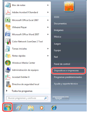 Configuración] → [Panel de control] → [Dispositivos e impresoras].En Windows 7/Server 2008 R2, haga clic en