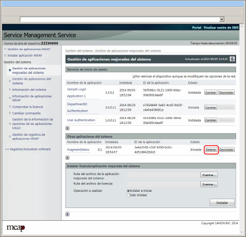 Haga clic en [Detener] para la aplicación que desee detener.