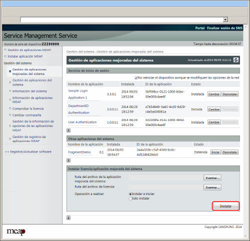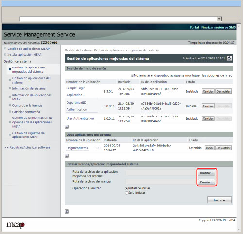 Al instalar una aplicación de sistema, debe especificar tanto el archivo de la aplicación como el archivo de licencia.