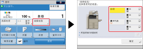 如果“设置/注册”的[功能设置]中设置了[基于色彩纸盒自动选择],根据复印时所选的色彩模式,可以执行自动纸张选择。(See "根据颜色指定纸盒自动选择.")