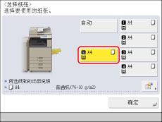 如果预先将信息存储到本机中,则添加到每个纸盒中的纸张类型的图标就可以显示在纸张选择屏幕上。(See "注册/编辑自定义纸张类型.")
