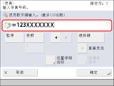 指定传真号码。也可以连续指定几个号码,并在一次操作中将原稿发送给几个接收方(多路发送)。