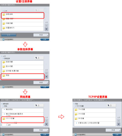 (设置/注册)→使用触摸面板显示屏幕以具有所需权限的用户身份登录。有关详细信息,请参阅"设置管理员."在[参数选择]的[网络]中指定设置,以适合网络环境。以下屏幕拍图说明指定网络设置的操作流程。