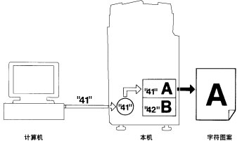 打印字母“A”时,主计算机将一个对应“A”的代码(此例中是一个十六进制数字41)发送到本机。此代码称为字符代码。本机在内部为每个字符都存储一个图案,并从这些字符图案中选择与已接收代码对应的图案。在这种情况下,本机搜索代表“A”的图案并打印该图案。打印字母的过程。