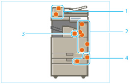如果在使用“装订”模式时发生卡纸并且打印停止,请勿从触摸面板显示屏幕上显示的存在卡纸的区域以外的其他位置清除卡纸。例如,如果主机中发生卡纸,请勿从不存在卡纸的分页装订处理器取出输出纸张。(清除主机中的卡纸后,打印和装订恢复。)