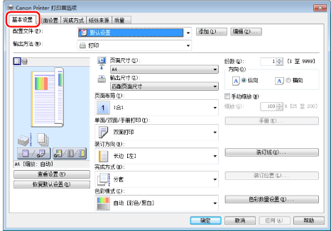 从[基础设置]选项卡中的[单面/双面/手册打印]选择[单面打印]。有关详细信息,请参阅“ 单面/双面打印。”