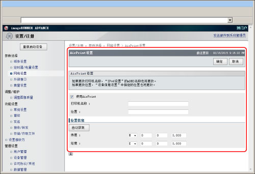 要检查位置,请查看[设备信息设置](“设置/注册”的[管理设置]中的[设备管理])中位置的值。