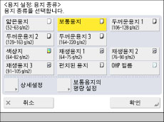 적재한 용지에 대한 용지 종류가 상세 설정 리스트에 표시되지 않는 경우에는 용지 종류를 등록할 수 있습니다. 용지 종류 등록에 대한 자세한 내용은 "사용자 설정 용지 종류 등록/편집."을 참고하십시오.