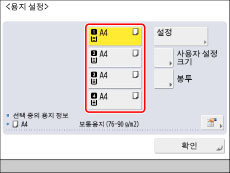 표준 크기 용지를 넣을 때 [사용자]가 용지 크기로 표시되는 경우 [사용자 설정 크기] → [설정 취소]를 누릅니다. 올바른 용지 크기가 자동으로 감지되어 화면에 표시됩니다.