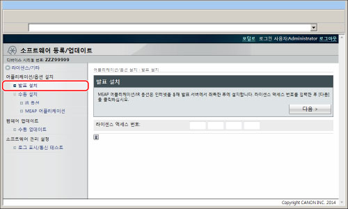 설치된 시스템 옵션/MEAP 어플리케이션에 따라, 설치 후 화면에 표시되는 URL에서 설명서 또는 시스템 옵션/MEAP 어플리케이션과 관련된 소프트웨어를 다운로드할 수 있습니다.