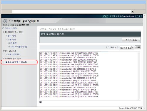 터치 패널 화면 또는 리모트 UI에서 설치/업데이트 이력을 표시할 수 있습니다.