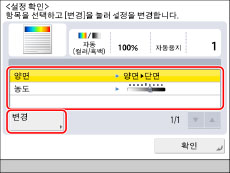 설정 확인 화면을 사용하여 복사 모드를 확인, 변경 또는 취소할 수 있습니다.