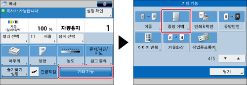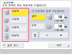 [중앙 여백]은 지정된 폭에 따라 전체 원고 이미지를 옮깁니다. 그러므로 이미지가 용지 가장자리 끝까지 있는 원고는 복사본이 부분적으로 잘릴 수도 있습니다.