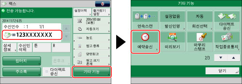 사전 설정된 송신 시간이 지정된 문서의 수신인 상황을 확인하거나 수신인을 취소 또는 변경할 수 있습니다. (See "송신 화면에서 작업.")