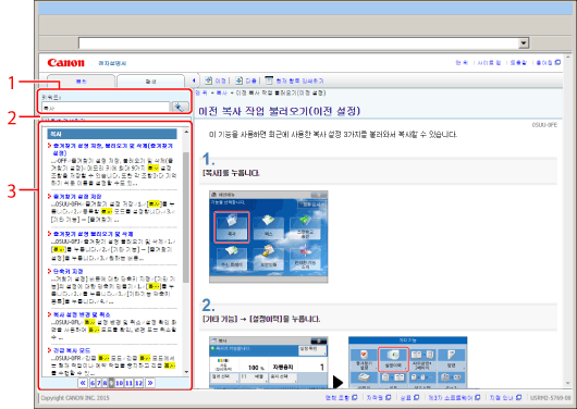 "맨 위 페이지" 위에 있는 입력 필드에 또는 "항목 페이지"의 검색 영역에 키워드를 입력하고 나서