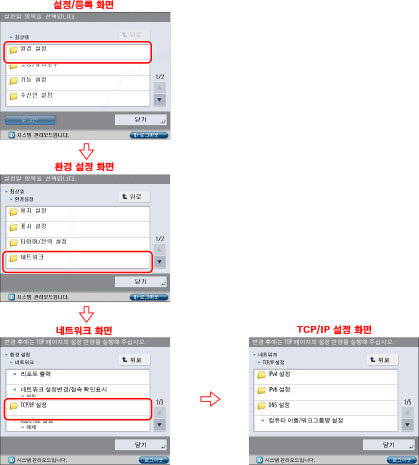 (설정/등록)을 누르고 → 터치 패널 화면을 사용하여 필요한 권한을 가진 사용자로 로그인합니다. 자세한 내용은 "관리자 설정."을 참고하십시오.네트워크 환경에 맞게 [환경 설정]의 [네트워크] 설정을 지정합니다. 다음의 스크린 샷은 네트워크 설정을 지정하기 위한 조작 순서를 보여줍니다.
