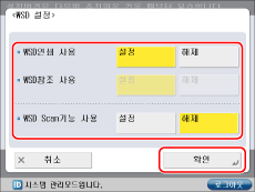WSD 스캔 기능을 사용하려면 <WSD 스캔 기능 사용>에서 [설정]을 누릅니다. [HTTP 사용]은 [설정]을 선택한 경우 자동으로 '설정'으로 설정합니다. WSD 스캔 기능에 대한 자세한 내용은
