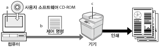 프린터 드라이버를 사용하여 인쇄할 데이터가 제어 명령으로 변환됩니다.