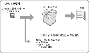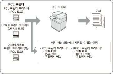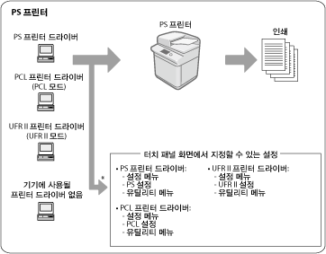 UFR II, PCL, PS 및 다이렉트 인쇄 프린터의 조작 차이점