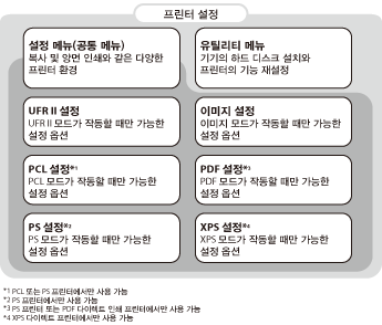 프린터 설정은 아래 메뉴로 구성됩니다.