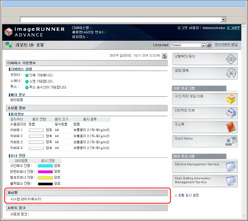 또는 리모트 UI의 포탈 페이지에 표시될 메시지를 입력합니다. 한 줄당 23개 문자까지 입력할 수 있고 4줄까지 메시지를 입력할 수 있습니다.