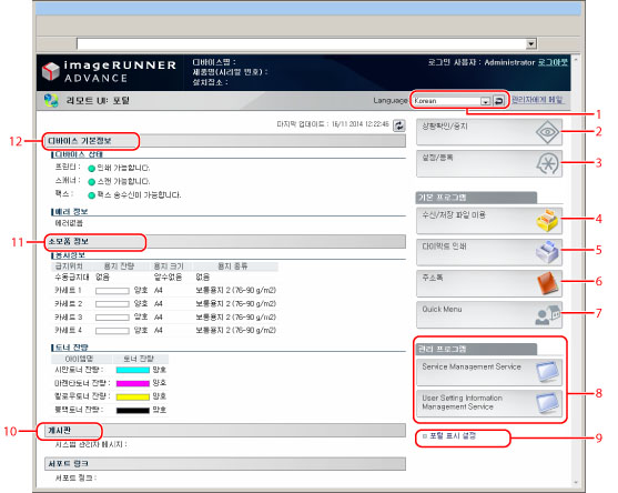 터치 패널 화면 또는 리모트 UI에서 시스템 관리자의 메시지를 표시합니다. (See "관리자 설정.") 게시판 표시 또는 삭제에 대한 정보는 "게시판 표시/삭제."를 참고하십시오.