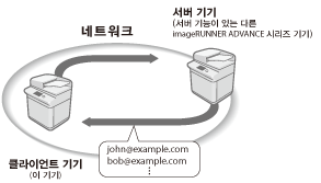이 기기에서는 네트워크의 서버 기기를 클라이언트 기기로 액세스하여 서버 기기의 주소록에서 수신인을 검색/지정할 수 있습니다.